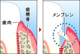 破壊された歯周組織を除去し根面を清潔にします。そこにメンブレンという特殊な膜で、歯槽骨・歯根膜の回復させるスペースを作ります。歯槽骨は歯肉よりも再生速度が遅いため、このスペースを作ることによりそれぞれの組織の回復が可能となりました。